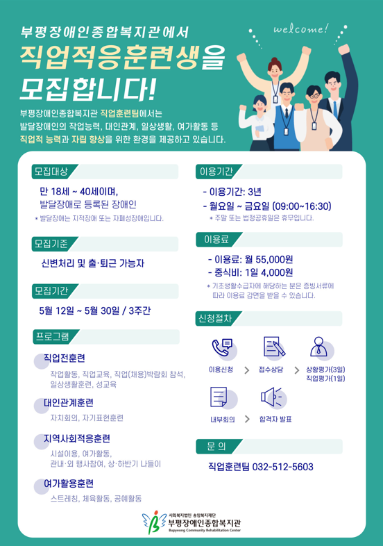 ºÎÆòÀå¾ÖÀÎÁ¾ÇÕº¹Áö°ü¿¡¼´Â Á÷¾÷ÈÆ·ÃÆÀ¿¡¼´Â ½Å±ÔÁ÷¾÷ÀûÀÀÈÆ·Ã»ýÀ» ¸ðÁýÇÕ´Ï´Ù. ![]() |