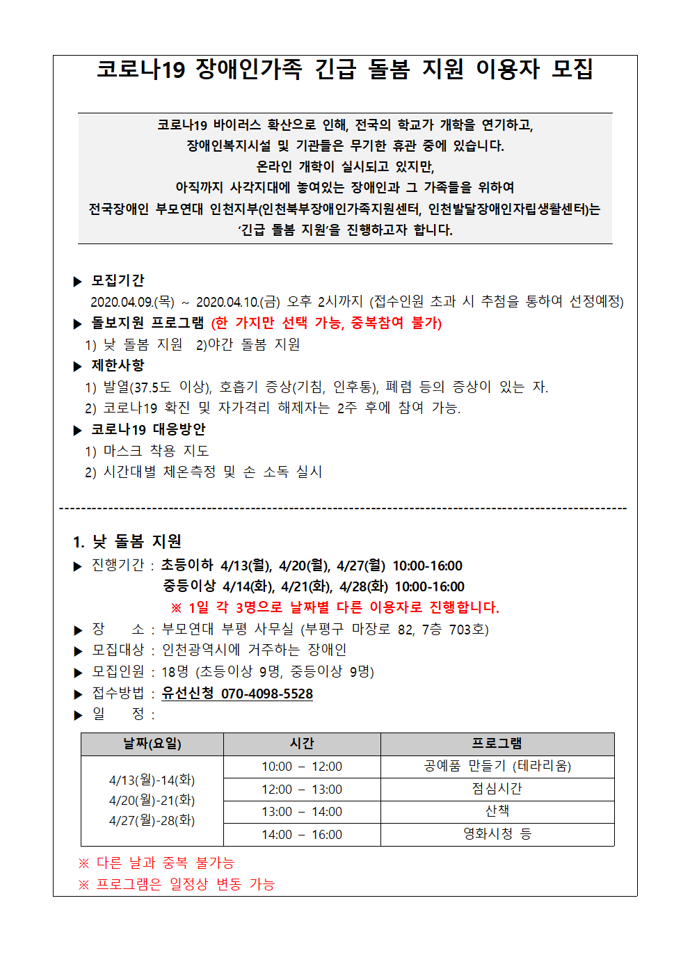 | Äڷγª19 Àå¾ÖÀΰ¡Á· ±ä±Þ µ¹º½ Áö¿ø ÀÌ¿ëÀÚ ¸ðÁý ¾È³» | |||